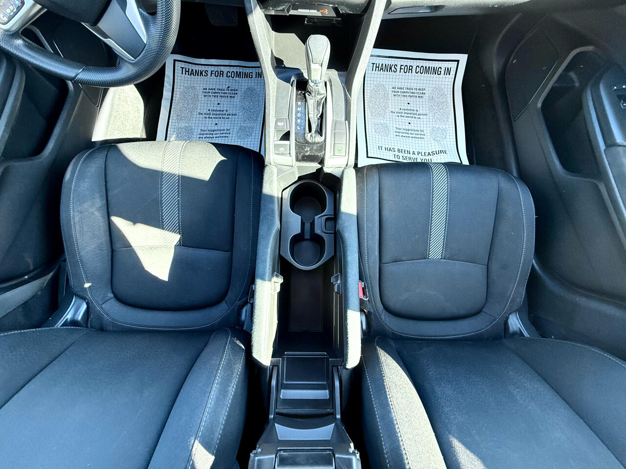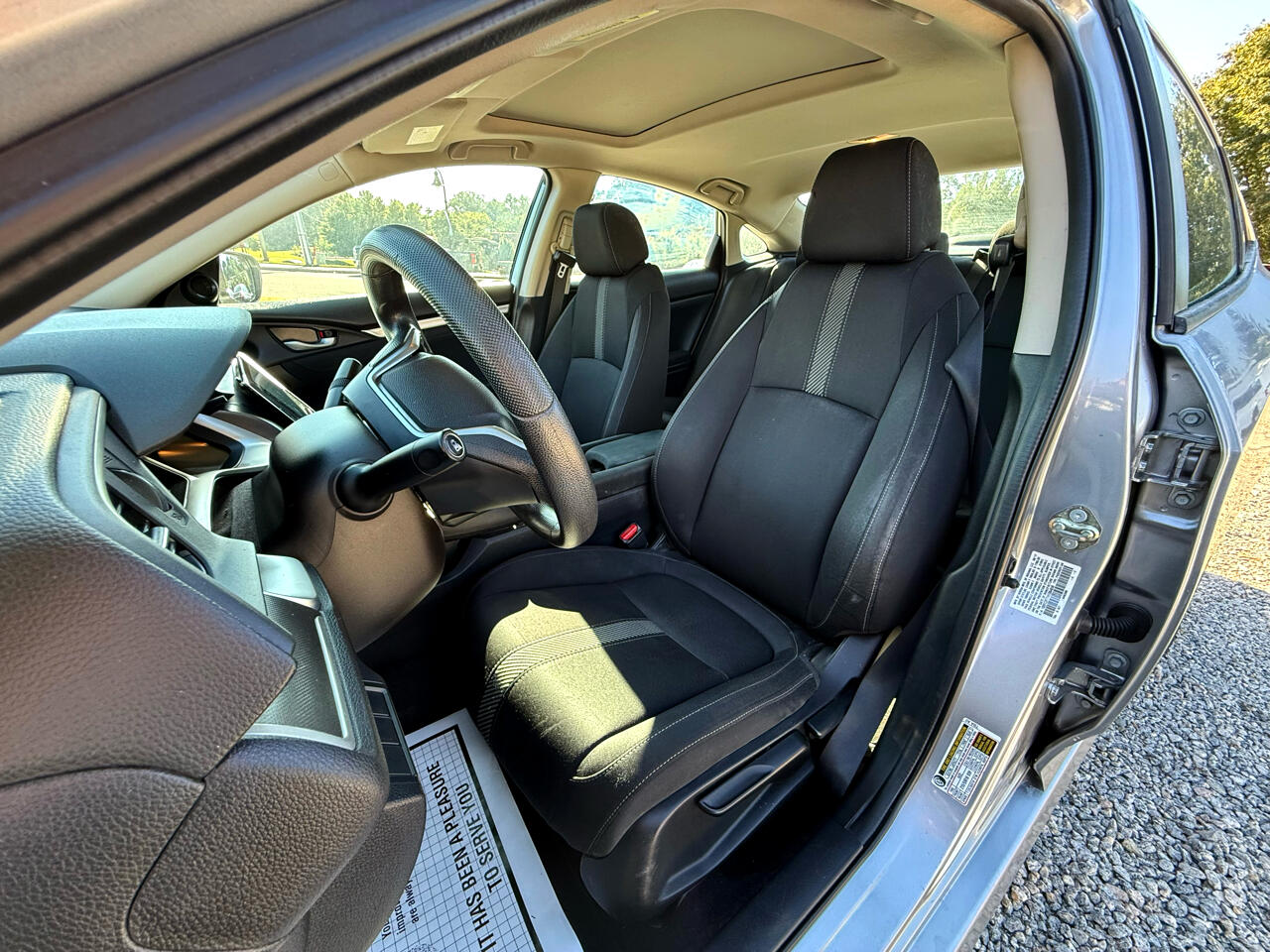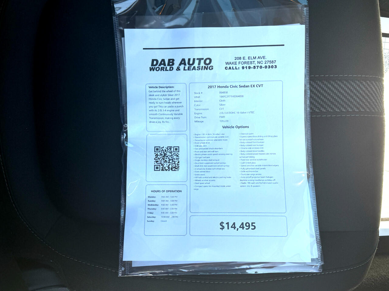 Get behind the wheel of this sleek and stylish Silver 2017 Honda Civic Sedan and get ready to turn heads wherever you go! This car packs a punch with its 2.0L I-4 engine and smooth Continuously Variable Transmission, making every drive a joy. Its front-wheel drive ensures a responsive and enjoyable driving experience, while the electric power-assist speed-sensing steering adds precision to your maneuvers.Step inside the spacious cabin and enjoy the premium features this Civic has to offer, from the radio with a 7-inch display to the comfortable reclining front bucket seats. With its sunroof, you can let the sunshine in as you cruise down the road in style. Plus, with safety features like side airbags, a backup camera, and rear child safety locks, you can drive with peace of mind.