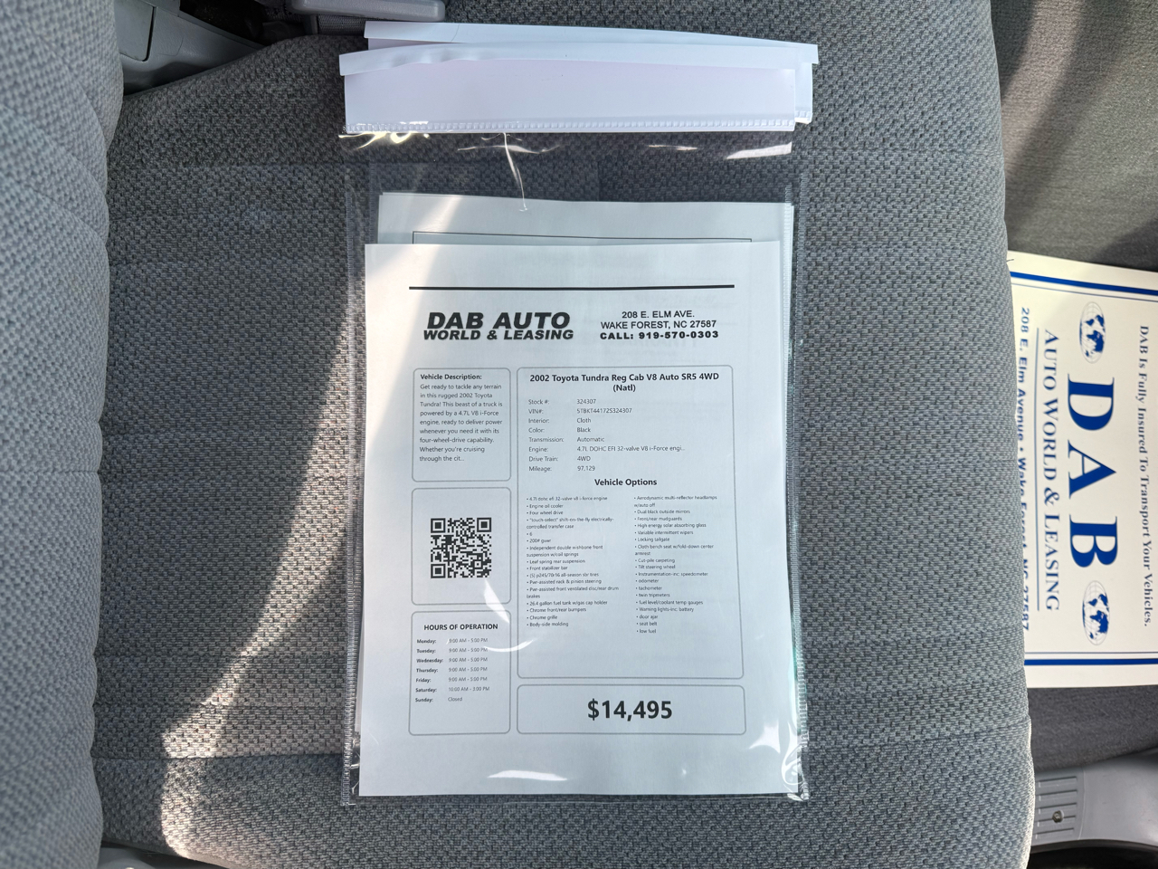 Get ready to tackle any terrain in this rugged 2002 Toyota Tundra! This beast of a truck is powered by a 4.7L V8 i-Force engine, ready to deliver power whenever you need it with its four-wheel-drive capability. Whether you're cruising through the city streets or hitting the backroads, this truck can handle it all with its Touch-Select shift-on-the-fly transfer case.Sporting a sleek black exterior with chrome accents, this Tundra is as stylish as it is powerful. The spacious cloth bench seat offers comfort on those long drives, while the dual sun visors provide extra convenience. Safety features abound in this truck, with driver/passenger airbags and seatbelt pretensioners for added peace of mind on the road.